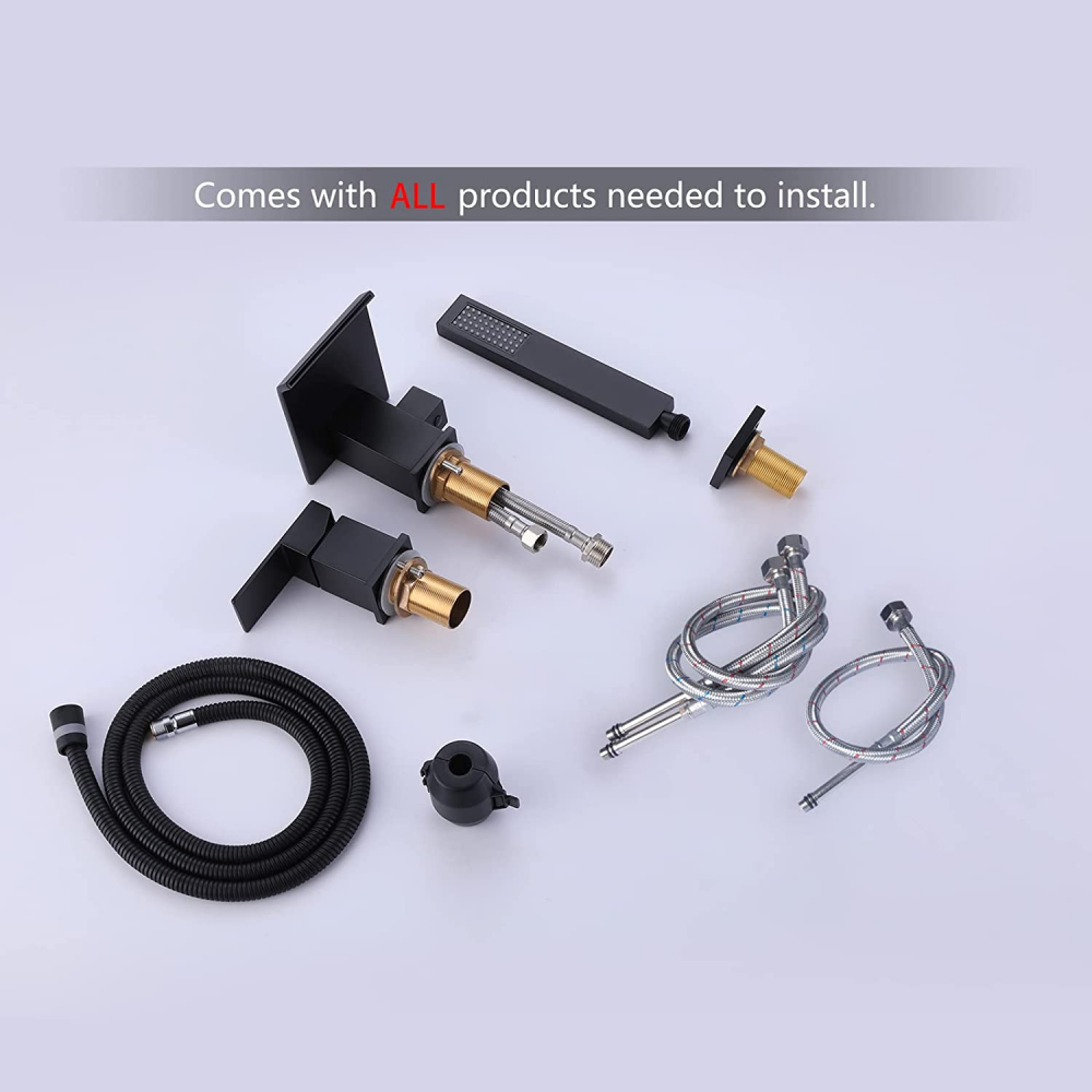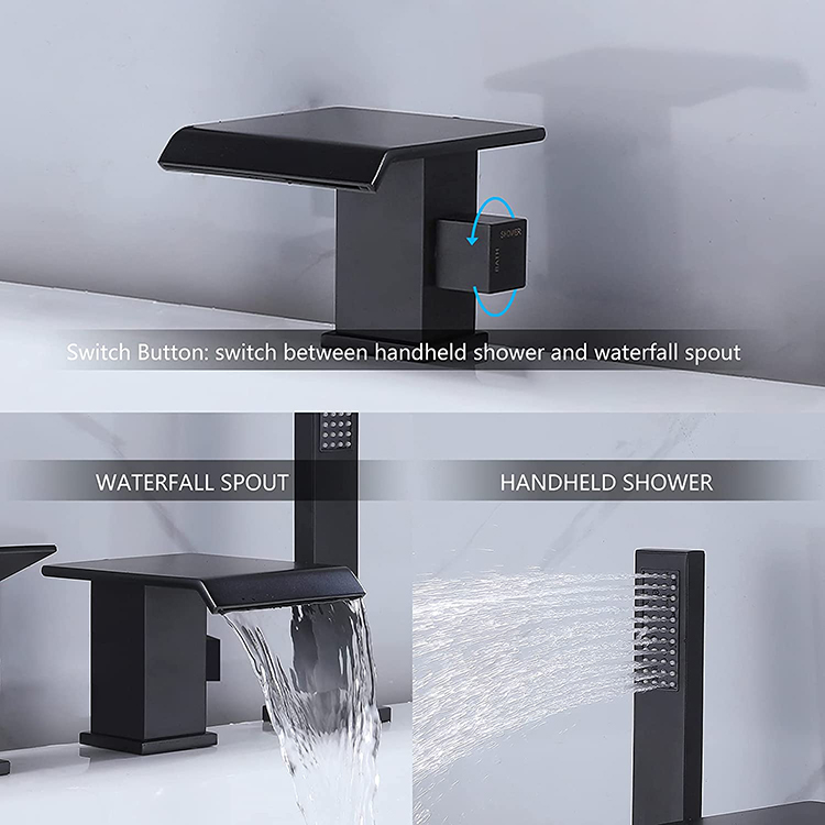 Introducing our sleek and sophisticated Black Deck Mount Tub Faucet with Hand Shower Sprayer! This exquisite addition to your bathroom will elevate your bathing experience to new heights. Crafted with premium quality materials, its black finish exudes a modern elegance that will effortlessly complement any decor. The hand shower sprayer offers ultimate convenience, allowing you to enjoy a luxurious and customized bathing experience. With its easy installation and durable construction, this deck mount tub faucet is built to last. Upgrade your bathroom with this stylish and functional masterpiece, and indulge in the ultimate relaxation every time you step into your tub.